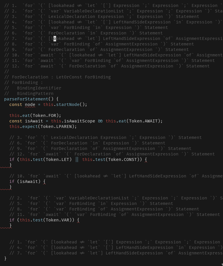 21:30 | <Bakkot> | @devsnek yes: https://github.com/shapesecurity/shift-parser-js/blob/6776a563274992579c01dbb53789b1f032c7deed/src/parser.js#L690-L821 |