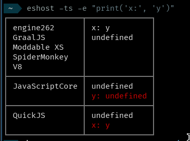 21:08 | <rkirsling> | `print('x:', 'y');` collapses for just JSC, but `'x', 'y';` collapses for everyone |