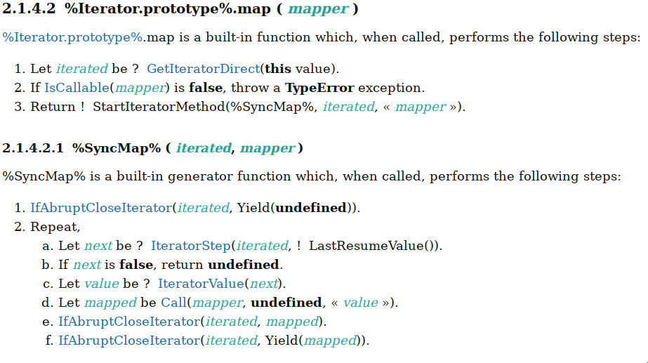 01:07 | <bakkot_> | that I couldn't tell you; the conclusion fo the last discussion I was involved in was "Each iterator helper object will have an internal slot that contains a generator-like algorithm (an abstract closure) with "Yield" steps, something like the %SyncMap% sketch @devsnek posted in #86." |