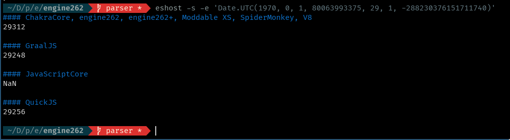| 21:21 | <Bakkot> | $ eshost -s -e 'Date.UTC(1970, 0, 1, 80063993375, 29, 1, -288230376151711740)' |