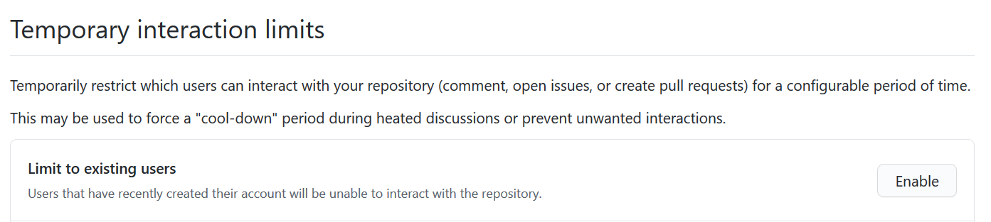 | 19:27 | <Domenic> | Eyeing this option... https://usercontent.irccloud-cdn.com/file/m3utstGN/repository-interaction-limits.png |