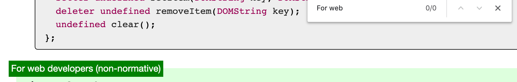 | 15:43 | <domfarolino> | Huh, I just realized that the domintro title boxes are not searchable I think bc of css ::before https://usercontent.irccloud-cdn.com/file/UNoTGbLt/Screen%20Shot%202020-12-05%20at%2010.41.58.png |