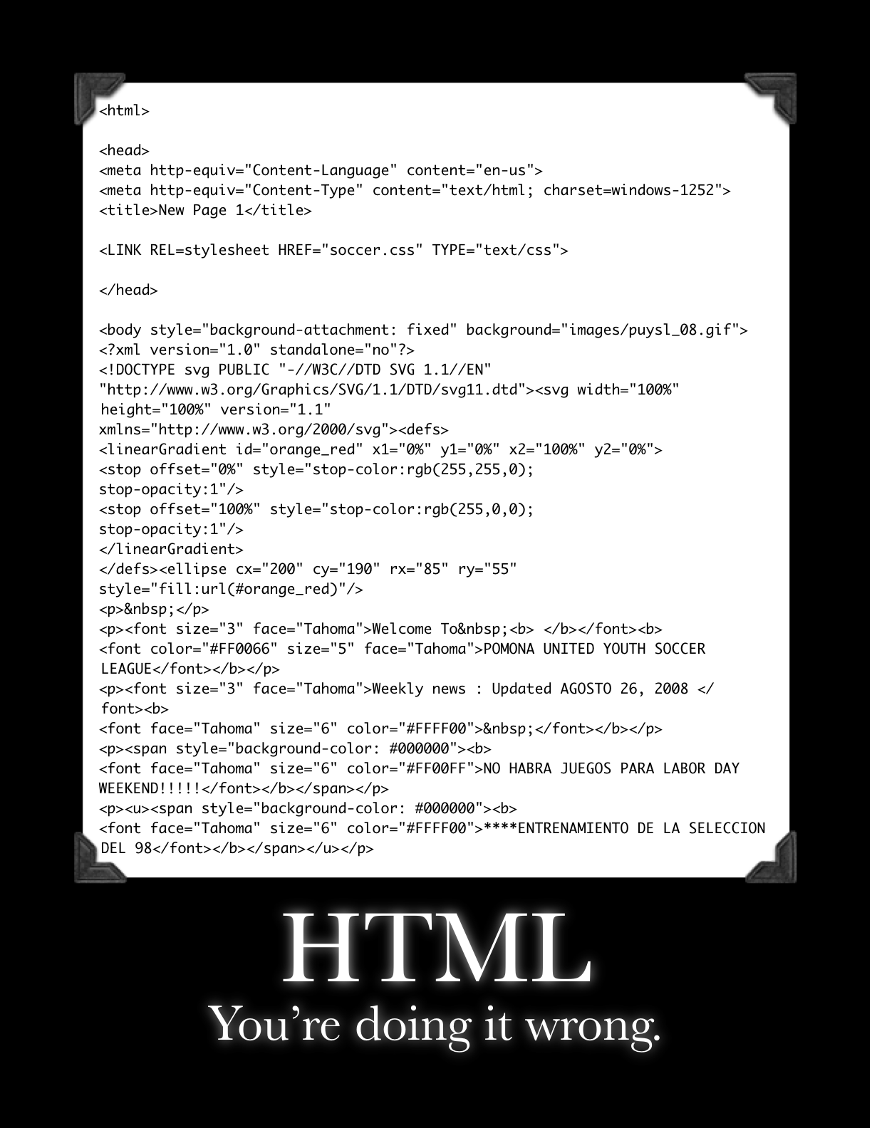 | 23:40 | <BenoitRen> | I first used plain text files. But then I had to start using coloured text as the game used them in special quests, so I just put it in a plain page with <pre>. and used <font>. This was back when I didn't know about the right way to do things. |